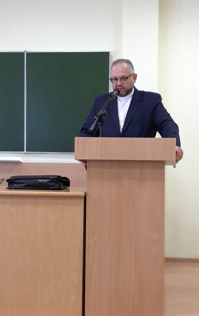 W trakcie bogato ilustrowanym wykładu ksiądz omówił zagadnienie wielkiej schizmy i strukturę hierarchii kościoła prawosławnego. Ważnym zagadnieniem było również przybliżenie samej obrzędowości prawosławia ze szczególnym uwzględnieniem budowy świątyń, ikon, liturgii oraz całego roku liturgicznego.