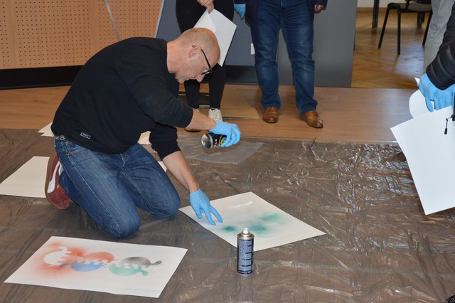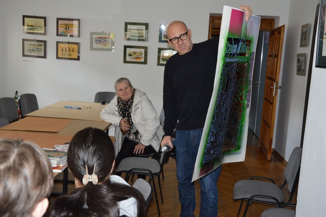 W trakcie zajęć uczestnicy z Łęczycy usłyszeli, że graffiti i sztuka ulicy, którymi wielu z nas dzisiaj się inspiruje, w bardzo dużym stopniu wpłynęły na sztuki. Kultura ludowa czy tradycyjna sztuka żydowska krzyżują się z kulturą miejską. Wiele ciekawych projektów można stworzyć na podstawie szablonów. Michał Arkusiński w trakcie zajęć wykorzystał szablon inspirowany zarazem ludowymi wycinanki ziemi łódzkiej jak i mizrach – tradycyjnymi wycinankami żydowskimi. W pracach wykonanych na warsztatach uczestnicy zmagali się z materią szablonu i obsługiwaniem puszki spreju.